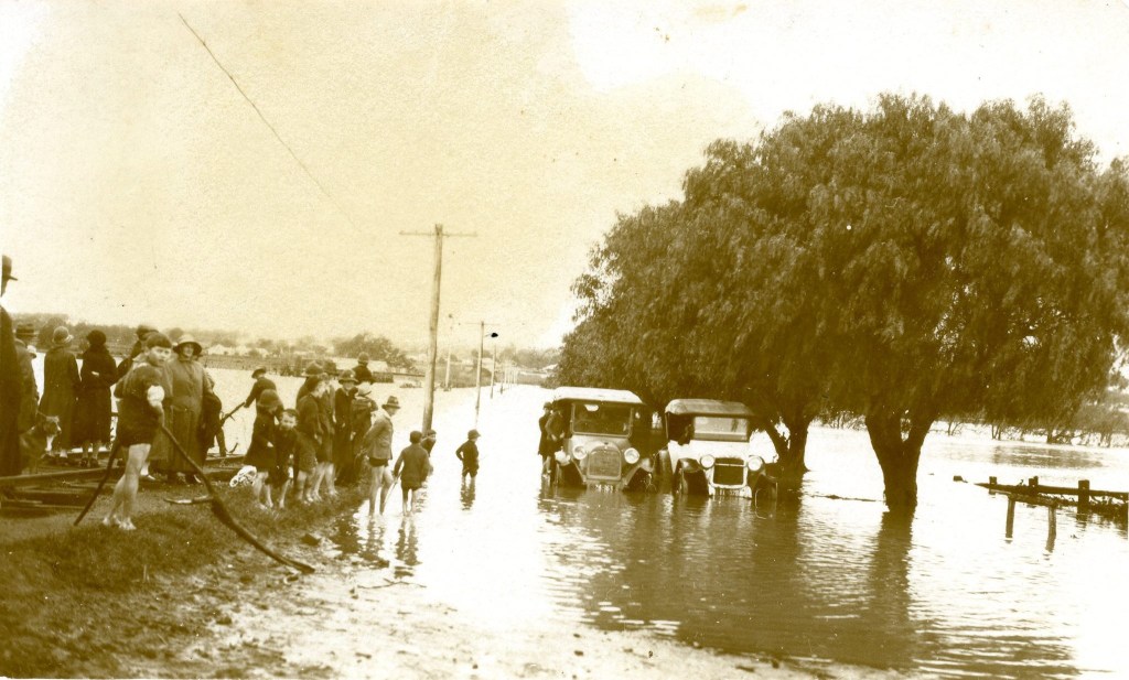 The Nepean River in flood in 1925 outside the milk depot on Argyle Street with a gathering crowd on the railway line and Elderslie in the far distance. The river channel is on the far side of the image, beyond the buildings. (Camden Images)