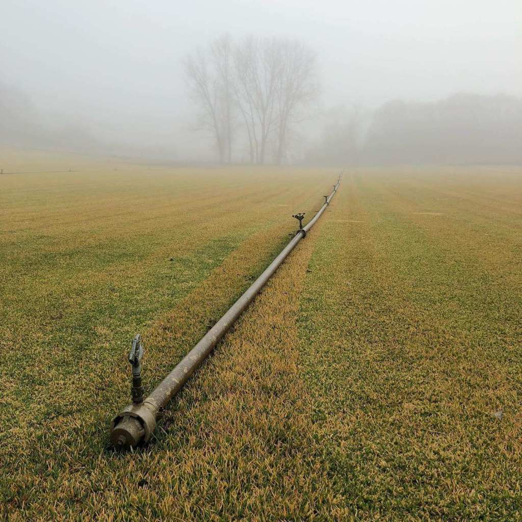 A foggy morning just before dawn on the Nepean River floodplain at Elderslie, showing irrigation infrastructure used to water the turf farm. (I Willis 2021)
