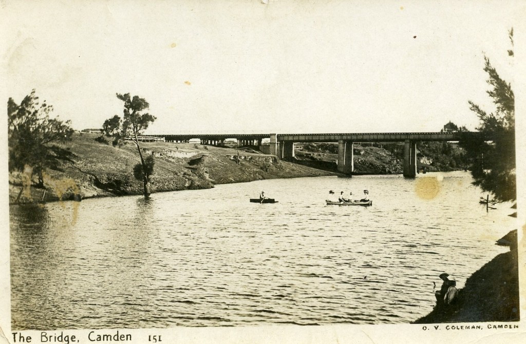 This is a postcard sold by OV Coleman around 1905. The title of the postcard is The Bridge. Camden Nepean River upstream of the Cowpasture Bridge with local folk canoeing on the river on a water body formed by the Camden Weir. Canoeing is still a popular pastime on this section of the river (The Bridge, OV Coleman, No151, c1905, CIPP).